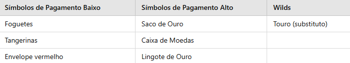 No Fortune Ox, você encontrará sete símbolos cativantes, divididos entre símbolos de pagamento baixo, alto e o símbolo wild. Confira a tabela abaixo para conhecê-los melhor: